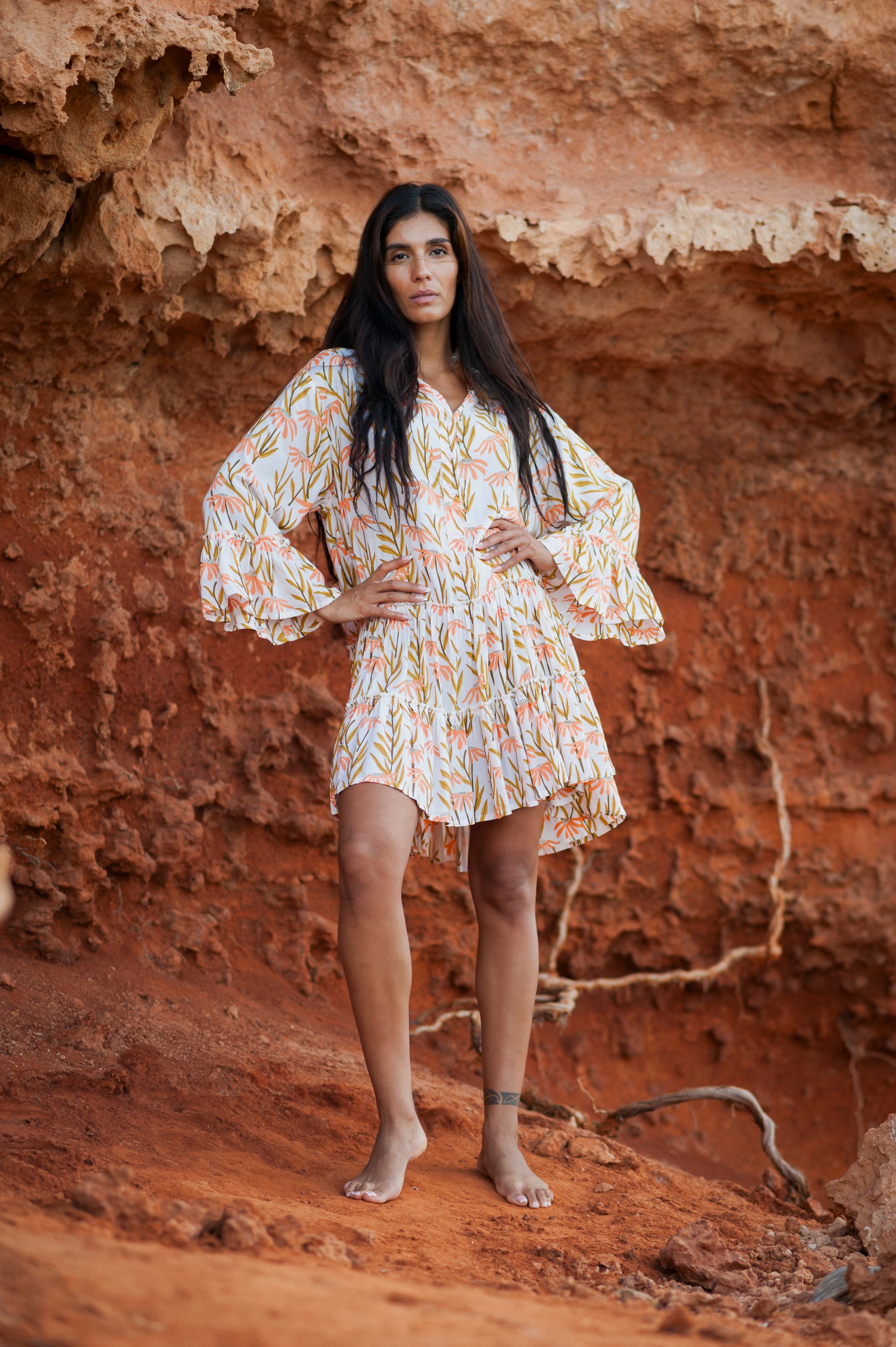 Vestido corto con volantes, ideal para usar con cinturón y botas.