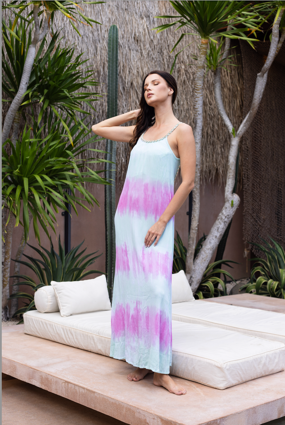 Vestido largo de tela suave y ligera con espalda descubierta . Bordado a mano con conchas naturales