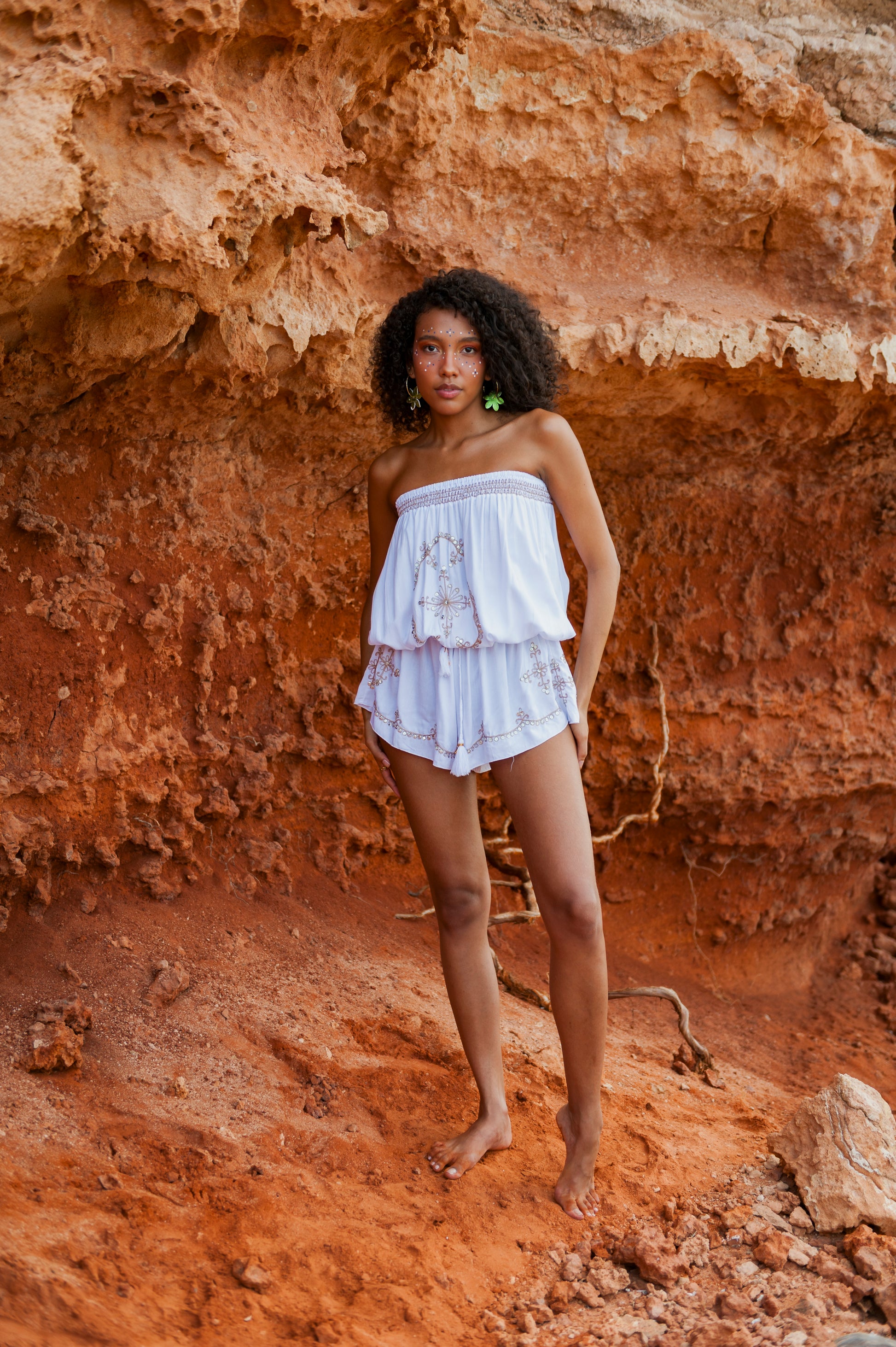 Mono cuello dama de honor y bolsillos, con apliques bordados.